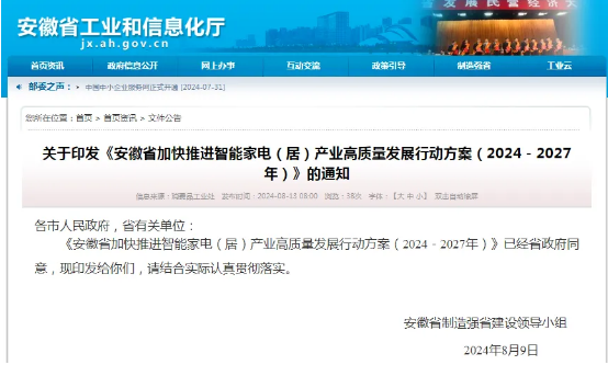 為推動(dòng)“大家電做強(qiáng)、小家電做大、智能家居做優(yōu)、配套體系做全”,推進(jìn)安徽省智能家電(居)產(chǎn)業(yè)向高端化、智能化、綠色化轉(zhuǎn)型升級(jí),近日,安徽省制造強(qiáng)省建設(shè)領(lǐng)導(dǎo)小組印發(fā)《安徽省加快推進(jìn)智能家電(居)產(chǎn)業(yè)高質(zhì)量發(fā)展行動(dòng)方案(2024-2...