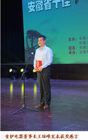 索伊電器董事長(zhǎng)王瓊峰榮獲安徽省“十佳環(huán)保人士”榮譽(yù)稱號(hào)