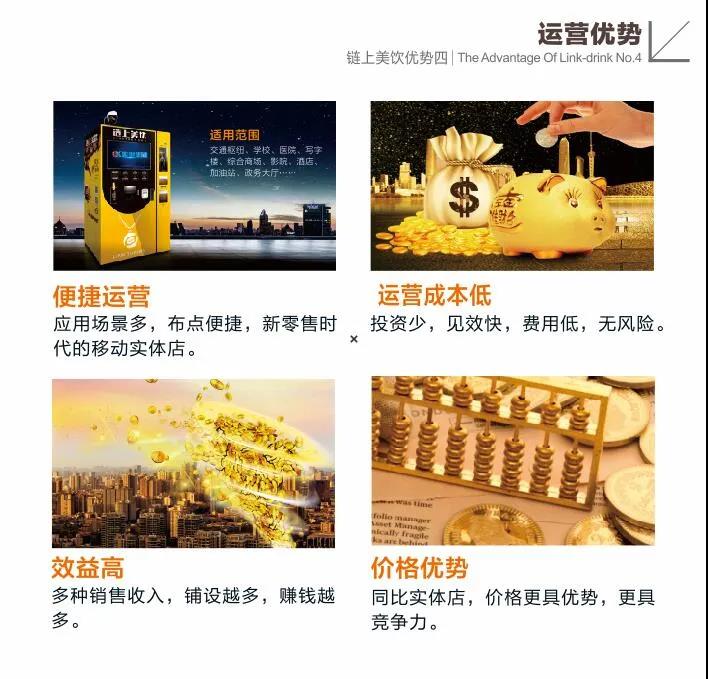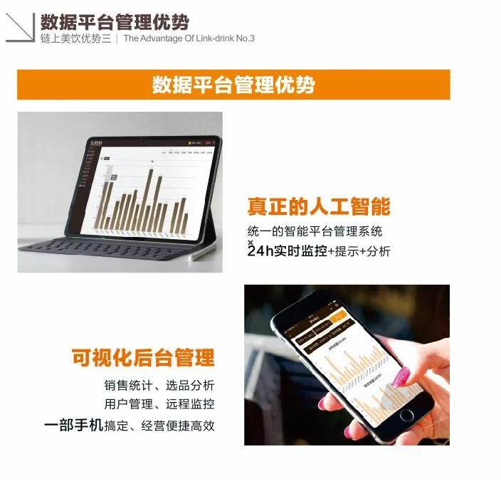 口味更多更營養(yǎng):索伊超大8+1料盒組合,兼顧熱飲、冷飲、冰飲等多種口味,使得現(xiàn)磨咖啡、現(xiàn)調(diào)奶茶、草本養(yǎng)生、冰鎮(zhèn)飲品等40余種飲品一機(jī)實現(xiàn);24小無人值售;數(shù)據(jù)化后臺管理,維護(hù)簡單方便;支持刷卡、掃碼,一鍵點擊,即時享用。