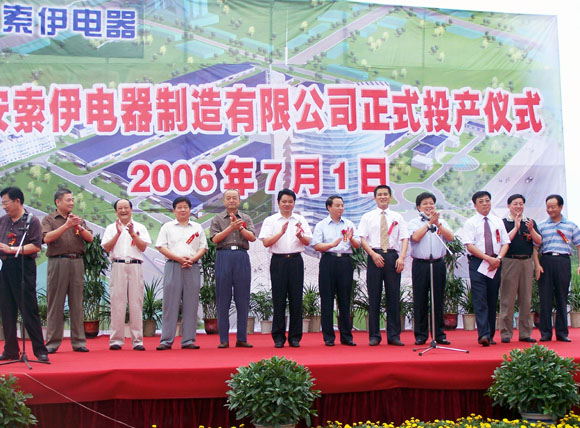 2006年7月1日,六安索伊電器制造有限公司第一條年產(chǎn)30萬臺(tái)電冰箱生產(chǎn)線建成投產(chǎn)。市領(lǐng)導(dǎo)倪發(fā)科、湯林祥、程世龍、汪永義、潘忠余、楊光祥、趙懷華等出席儀式。市委書記、市人大常委會(huì)主任倪發(fā)科、市長湯林祥為第一臺(tái)六安生產(chǎn)的索伊電冰箱下線剪彩。