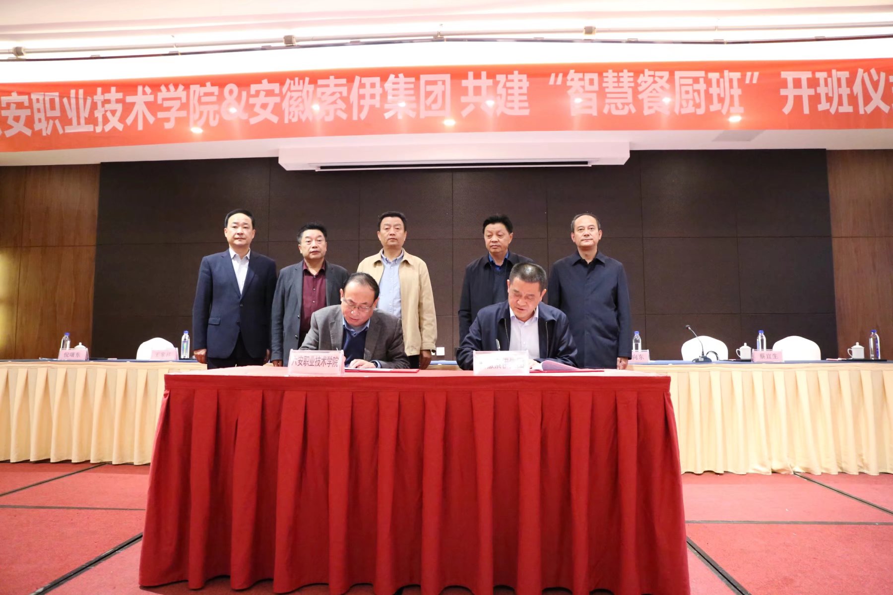 隨后,六安職業(yè)技術(shù)學(xué)院黨委副書記、院長葛向東和安徽索伊集團(tuán)董事長王瓊峰簽署了合作協(xié)議。最后,六安職業(yè)學(xué)院黨委書記周德福作重要講話。他說這次安徽索伊集團(tuán)與六安職業(yè)技術(shù)學(xué)院共建“智慧餐廚”班,就是探索校企合作的新模式,也是學(xué)院積極為企業(yè)服務(wù),為地方經(jīng)濟(jì)服務(wù)的具體體現(xiàn)。希望雙方相互合作,相互切磋,齊心協(xié)力把智慧餐廚班辦出特色,辦出好的效果。也希望同學(xué)們珍惜大好時光,認(rèn)真學(xué)習(xí),學(xué)好本領(lǐng),成就事業(yè),同時成就自己。